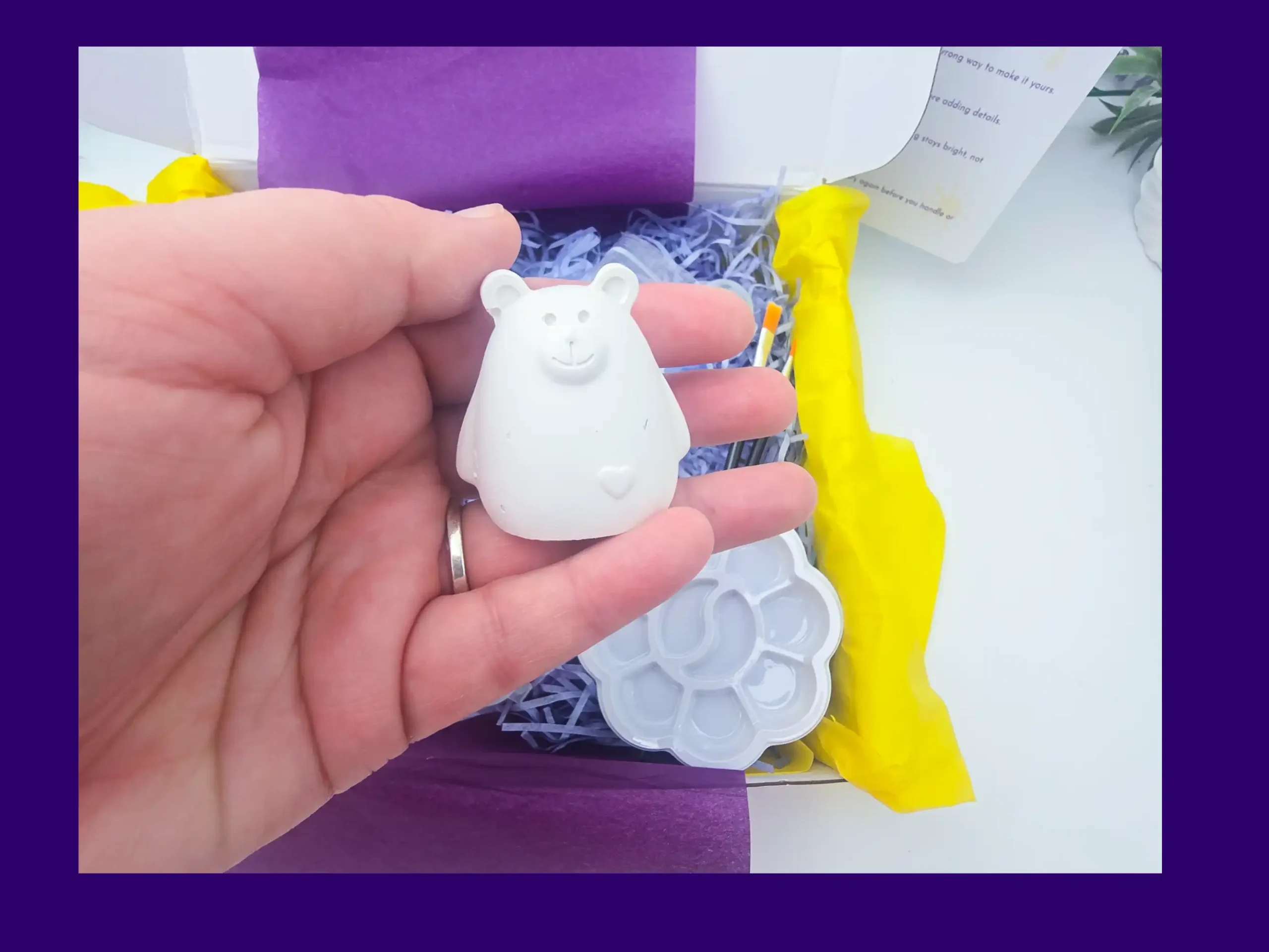- Acrylic paints, paint brushes, palette, glitter, and instruction card
