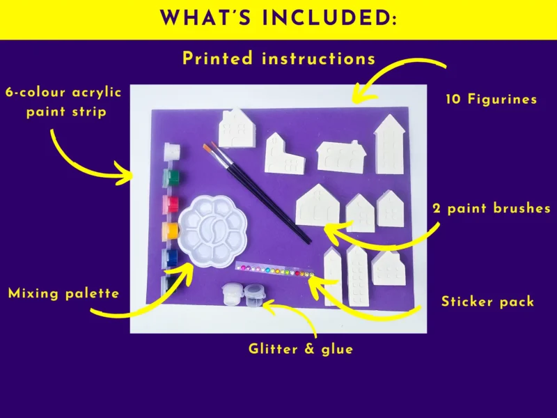 - Acrylic paints, paint brushes, palette, glitter, and instruction card