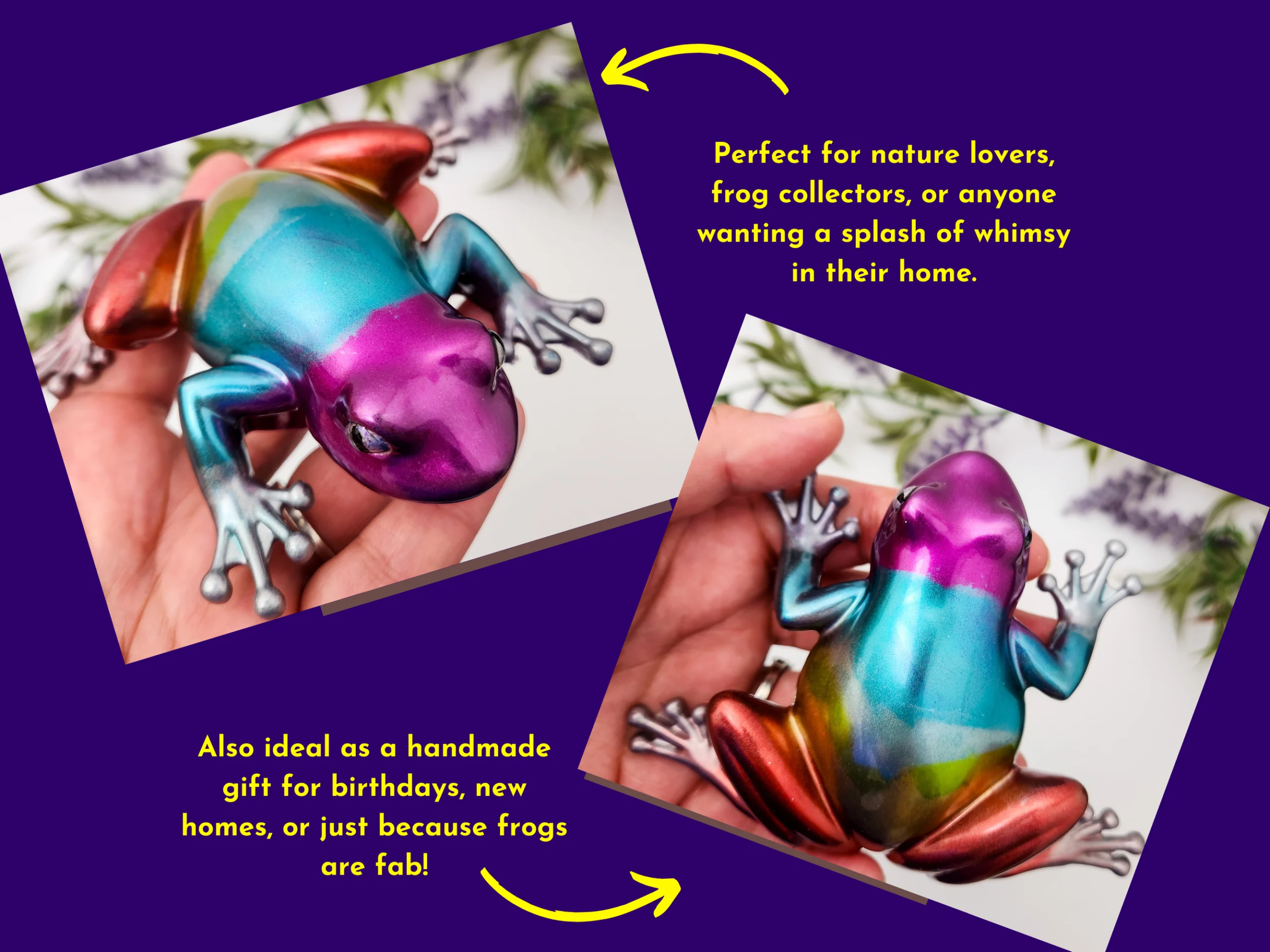 Say hello to the frog that turned up to life dipped in pure metallic sass. This handmade chrome rainbow frog shifts from magenta to aqua to gold like it’s auditioning for a fantasy film—and honestly, it would get the part. Smooth, shiny, and unapologetically fabulous, it’s perfect for collectors, colour lovers, or anyone whose home décor could use a little “hell yes”.