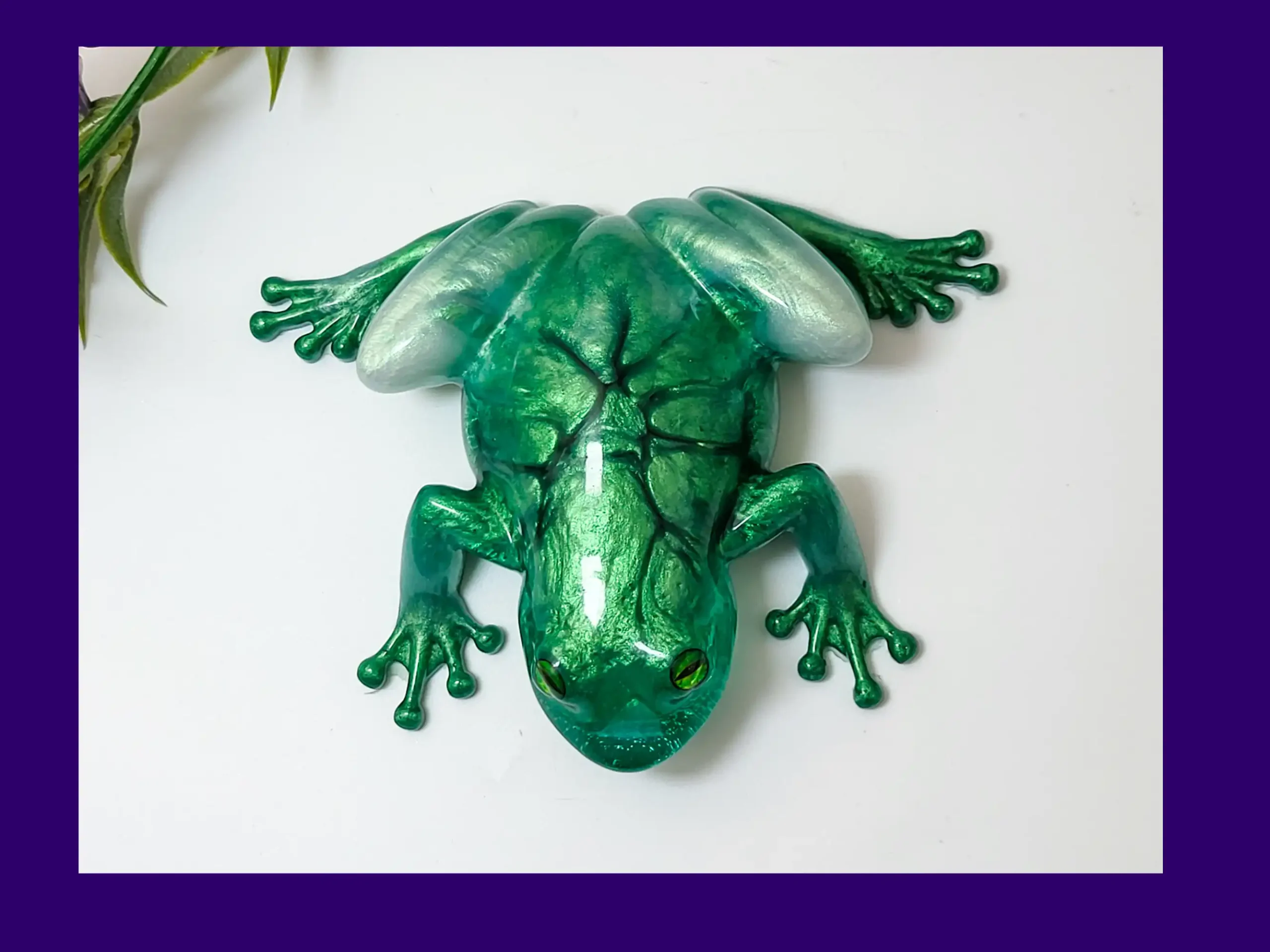 A vibrant one-of-a-kind emerald resin tree frog, handcrafted with shimmering green tones and silver highlights. Perfect as wall art, shelf décor or a quirky gift for frog lovers.