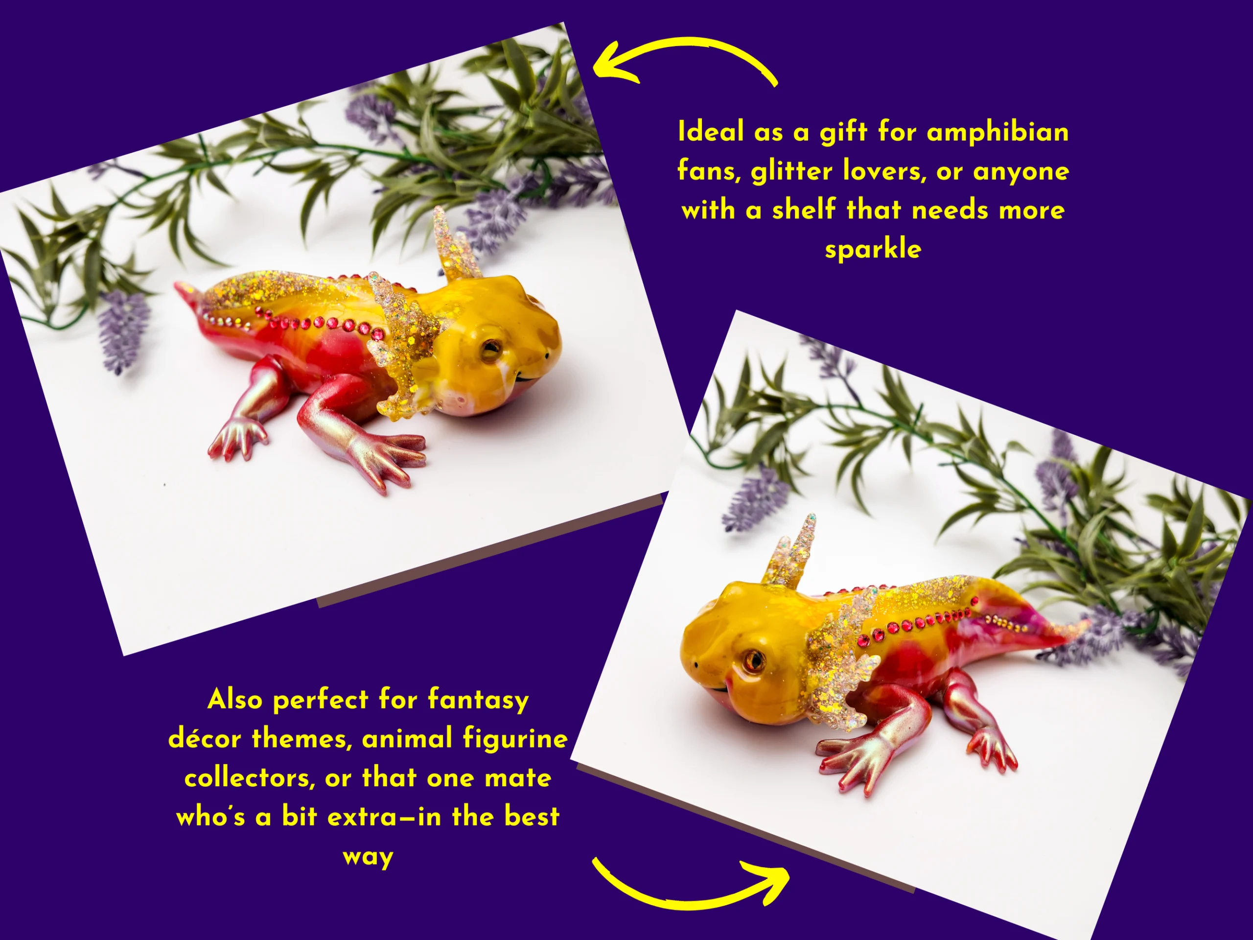 Hand-poured in our Kirnix cave and finished with shimmer pigments, sparkle blends, and rhinestone detailing, this one-of-a-kind showstopper is perfect for fantasy décor lovers, amphibian fans, or anyone whose shelf could use a little more fabulous chaos.